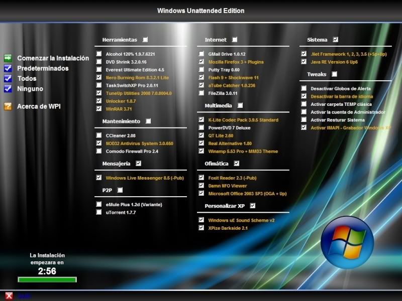 1. .Net Framework 1, 2, 3, 3.5 (+Sp+Up) 2. Alcohol 120% 1.9.7.6221 3. aTube Catcher 1.0.236 4. CCleaner 2.08 5. Comodo Firewall Pro 2.4 6. Damn NFO Viewer 7. DVD Shrink 3.2.0.16 8. eMule Plus 1.2d {Variante} 9. Everest Ultimate Edition 4.5 10. FileZilla 3.0.11 11. Flash 9 + Shockwave 11 12. Foxit Reader 2.3 (-Pub) 13. GMail Drive 1.0.12 14. Java RE Version 6 Up6 15. K-Lite Codec Pack 3.9.5 Standard 16. Microsoft Office 2003 SP3 (OGA + Up) 17. Mozilla Firefox 3 + Plugins 18. Nero Burning Rom 8.3.2.1 Lite 19. NOD32 Antivirus System 3.0.650 20. PowerDVD 7 Deluxe 21. Putty Tray 0.60 22. QT Lite 2.60 23. Real Alternative 1.80 24. TaskSwitchXP Pro 2.0.11 25. TuneUp Utilities 2008 7.0.8004 26. Unlocker 1.8.7 27. uTorrent 1.7.7 28. Winamp 5.53 Pro + MMD3 Theme 29. WinRAR 3.71 30. XPize Darkside 2.1 31. Windows Live Messenger 8.5 (-Pub) 32. Windows uE Sound Scheme v2